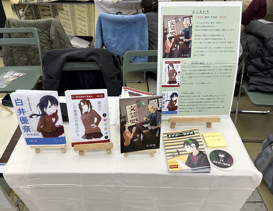 また、お題作品制作の作品集の配布を行いました。小説3作品掲載で、表紙絵も文芸処のメンバーが描いてくださいました。結構余裕を持って〆切を設けたはずですが、〆切ギリギリになる人もいましたけれど笑 それでもなかなか素敵な作品集が出来上がったのではないかと個人的には思います。